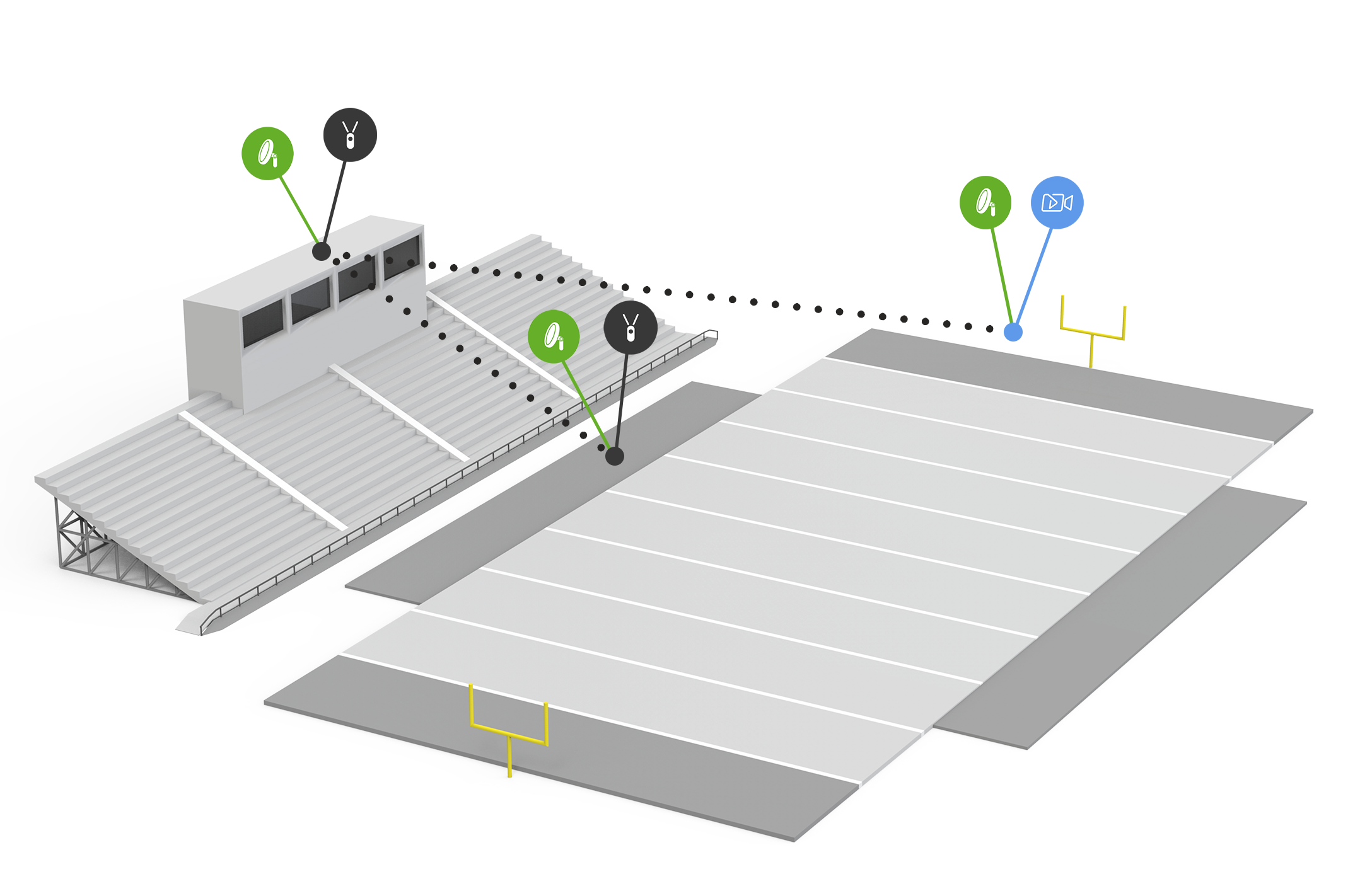 2019 Smart Camera - Three-point network. Endzone video is sent to Pressbox via it's own dedicated bridge antenna. The Pressbox has its own dedicated bridge antenna that it relays to the network setup on the Sideline. The Pressbox and the Sideline have their own dedicated iPad antennas for hotspot connectivity.